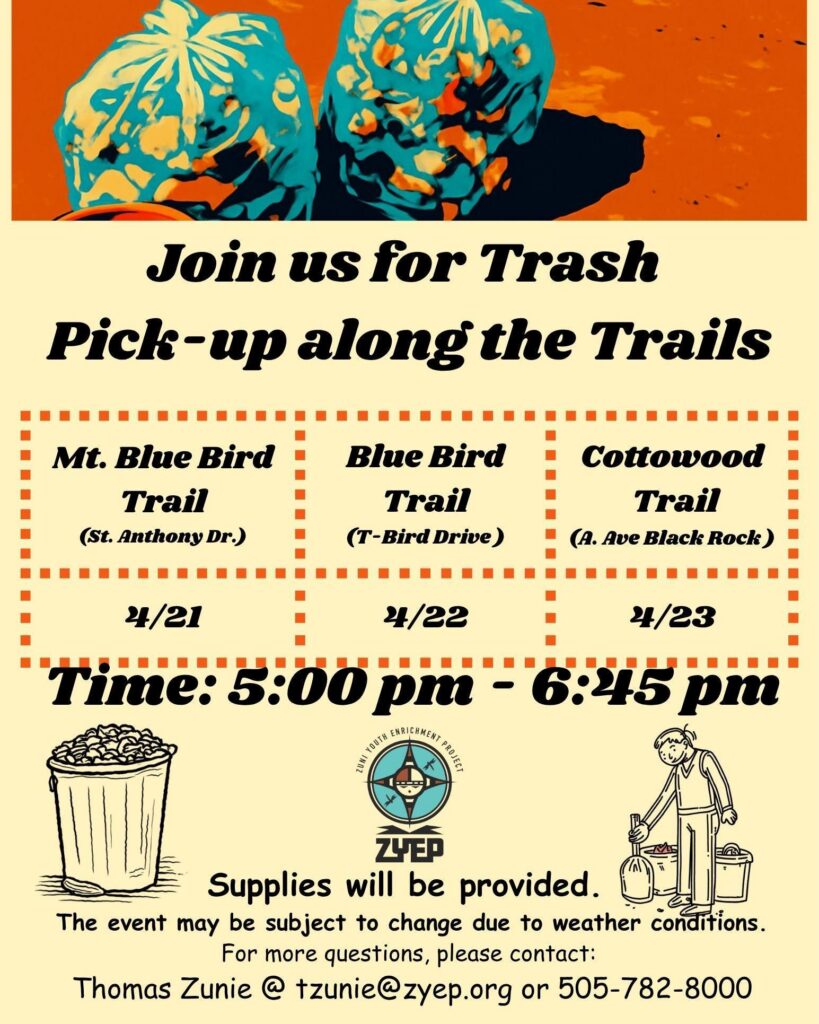 Let’s walk together, clean together, and honor Mother Earth. Join us as we host a community Trail Clean-Up- Supplies provided- Refreshments served- Time to connect and give back4/21 - Mt. Bluebird Trail (meet at the end St. Anthony Drive)4/22 - Blue Bird Trail (Meet at T-bird Drive -Trail start)4/23 - Cottonwood Trail (meet at old fitness place) ... See MoreSee Less
