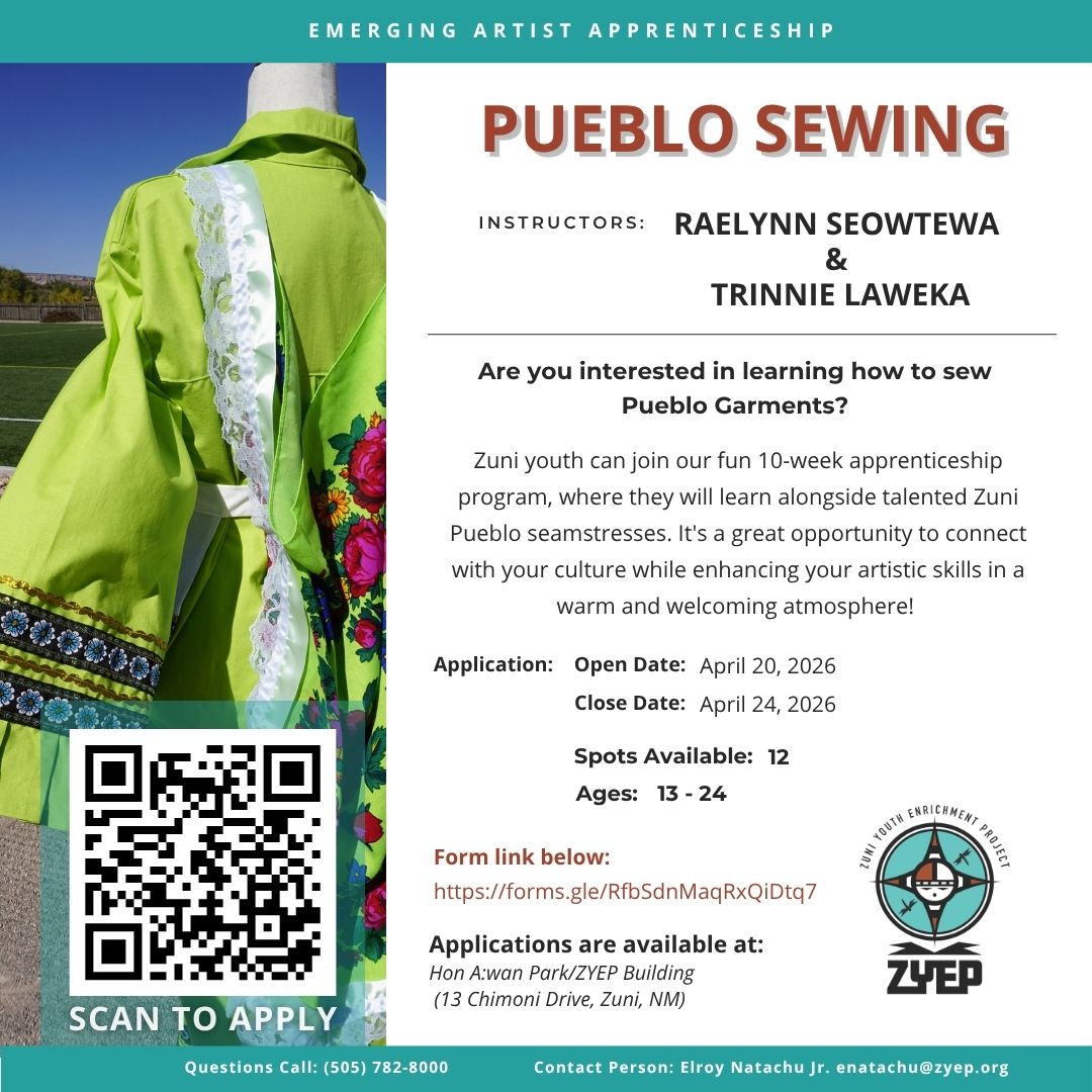 Zuni Youth can dive into the world of Pueblo Sewing with our talented Zuni Pueblo Seamstresses, Raelynn Seowtewa and Trinnie Laweka. Our instructors are passionate about nurturing creativity and developing skills, and they are ready to support this journey! Follow the link below to apply!